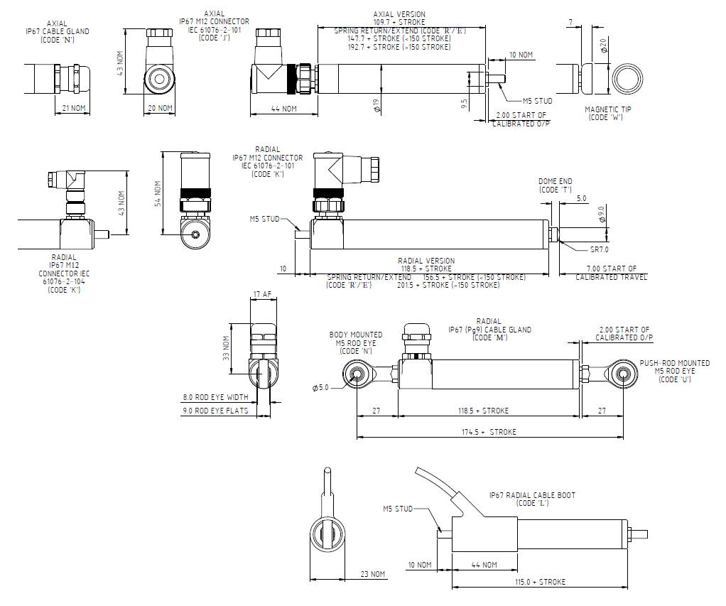 Overall performance, repeatability and stability are outstanding over a wide temperature range. The sensor is easy to install with mounting options including M5 rod eye bearings and body clamps. The push rod by default is supplied, free or captive, with female M5x0.8×10 long thread. Alternatively, M5 rod eye, dome end or magnetic tip options are available too. Captive push rods can be sprung loaded, in either direction, on sensors up to 350mm of travel. The LS17 also offers a wide range of mechanical and electrical options and is IP67 rated. The ability for the LS17 to remain unaffected by external electromagnetic interference is assured by the built in EMC protection that conforms to EN 61000-6-2 and EN 61000-6-3 standards.